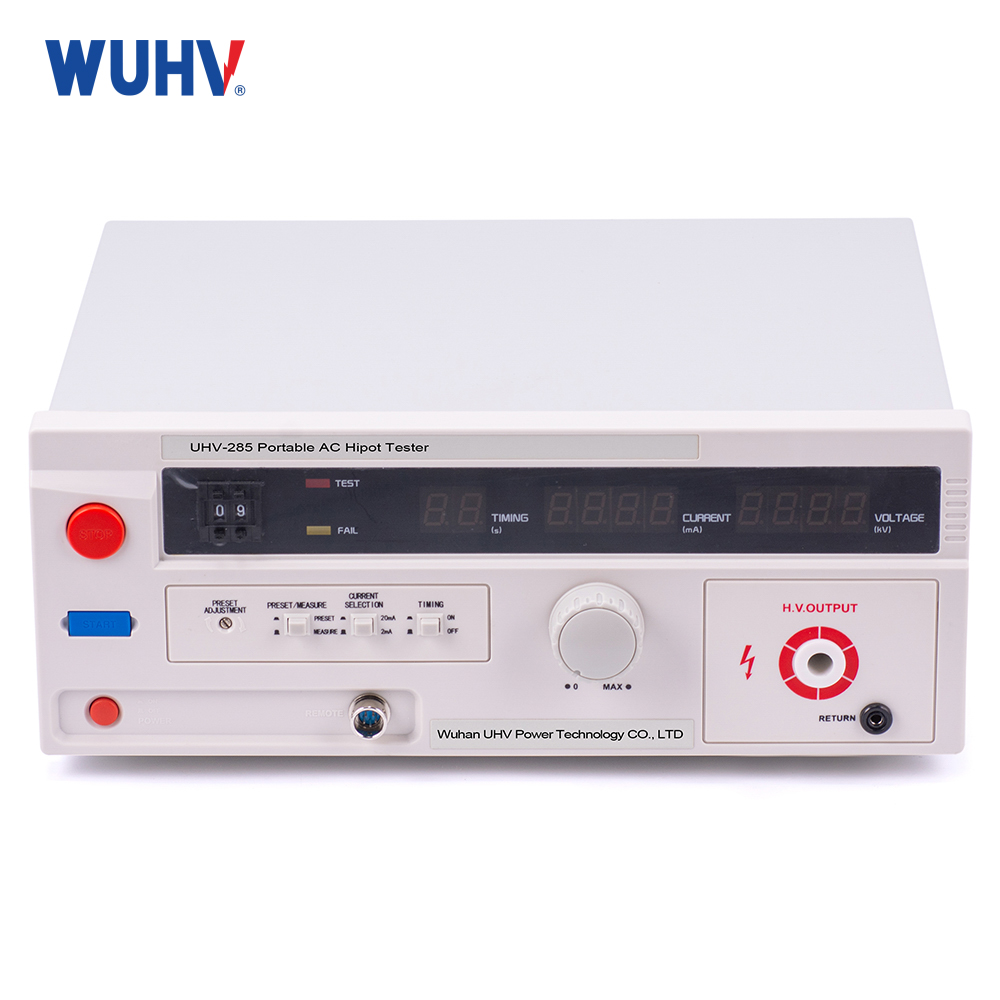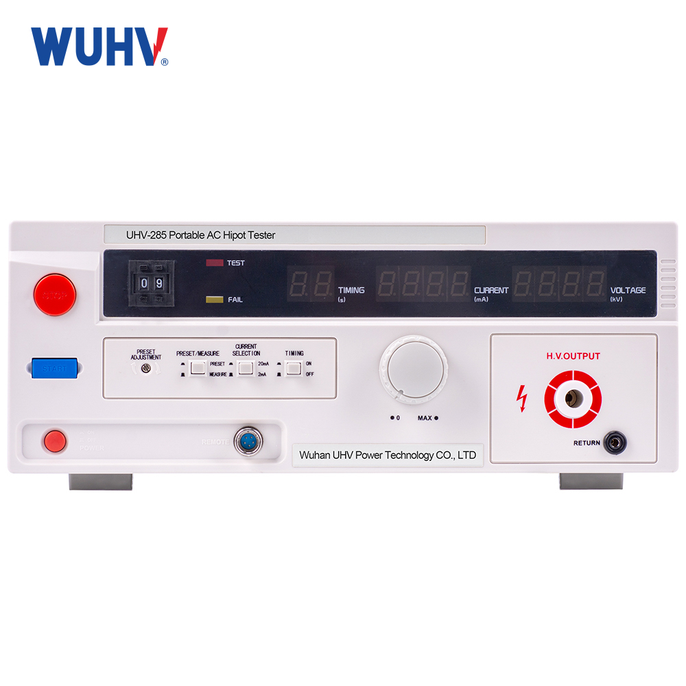 UHV-285 Portable Hipot Tester is an AC high-voltage safety testing instrument widely used for withstand voltage tests on electronic instruments, equipment, components, electrical appliances, Bakelite products, rubber materials, high-voltage cables, and motors. It is also suitable for safety testing of household appliances.
