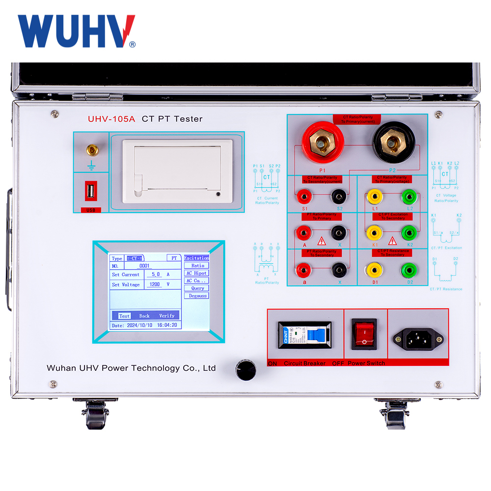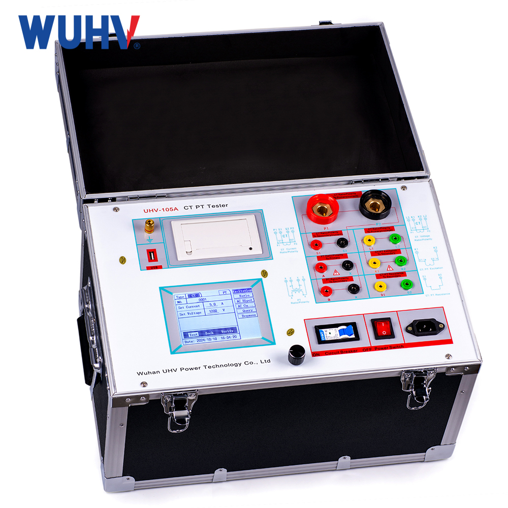 CT PT Characteristic Tester is a portable instrument designed for on-site verification of Protection-class (P-class) Current Transformers (CTs) and Voltage Transformers (VTs/PTs). It performs key tests including excitation characteristic (knee-point, saturation), turns/ratio testing, polarity verification, core demagnetization (degaussing), 5% and 10% error curve derivation, secondary circuit continuity and burden measurement, secondary winding insulation withstand (power frequency AC), and secondary load testing. Equipped with an integrated LCD display, a built-in micro printer for instant field reports, and USB data export capabilities, it offers comprehensive functionality with streamlined operation for efficient field use.