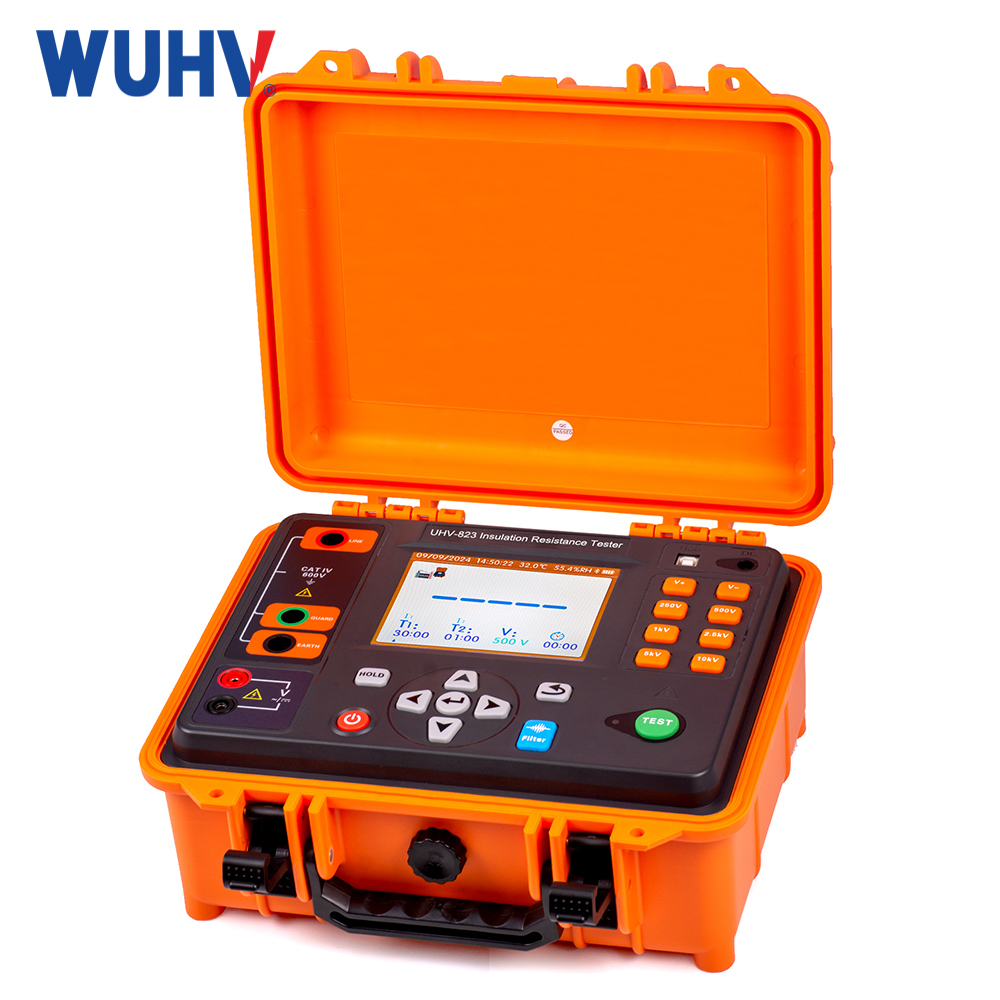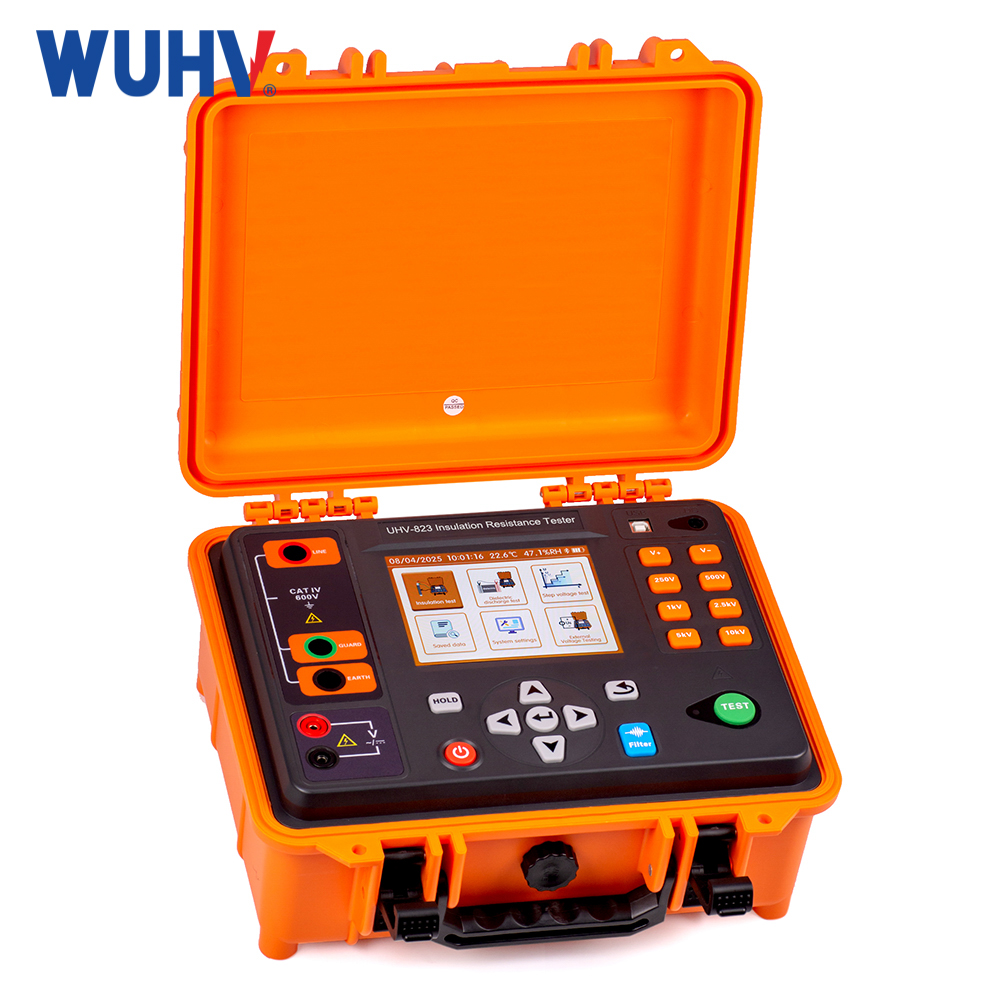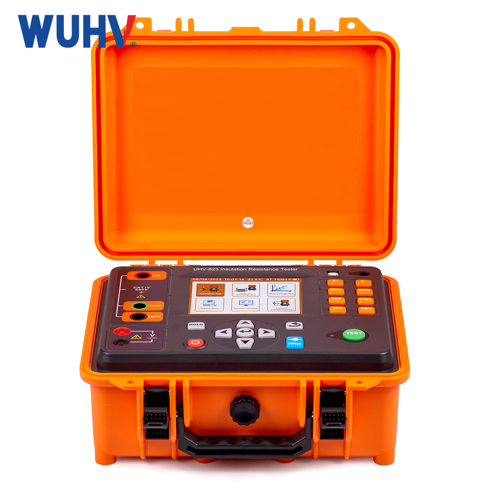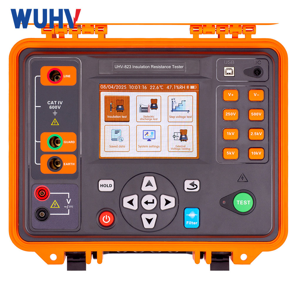 Insulation Resistance Tester features a high-voltage measurement system with multiple test modes, including dielectric discharge, external voltage, and step voltage tests. The rugged, dust/water-resistant design incorporates a 5.6" color LCD with bilingual interface (Chinese/English), micro-current measurement, and automatic discharge. With 0.01MΩ resolution, Bluetooth-enabled mobile app (data/GPS/photo uploads), and three-wire measurement (including guard terminal for leakage current elimination), it ensures accurate insulation testing in power, telecom, industrial, and educational applications.